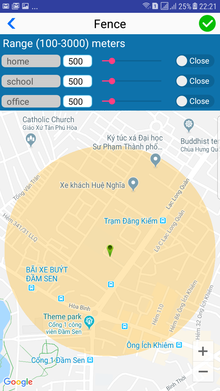 3./ Fence : thiết lập bán kính (m) cho phép . Nếu thiết bị ra khỏi bán kính này thì sẽ lập tức báo về cho quản lý biết ( Rất thích hợp để quản lý trẻ nhỏ , người già , thú cưng …)