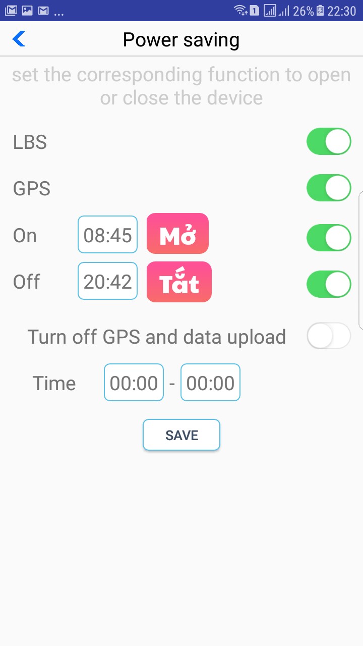 7./ Power Saving : Tiết kiệm pin cho thiết bị , bạn có thể cài đặt thời gian tắt và mở lại trong thời gian thiết lập . Việc này sẽ giúp kéo dài thời gian sử dụng pin thiết bị ( có thể dùng tới 1 tháng trong điều kiện tiết kiệm )