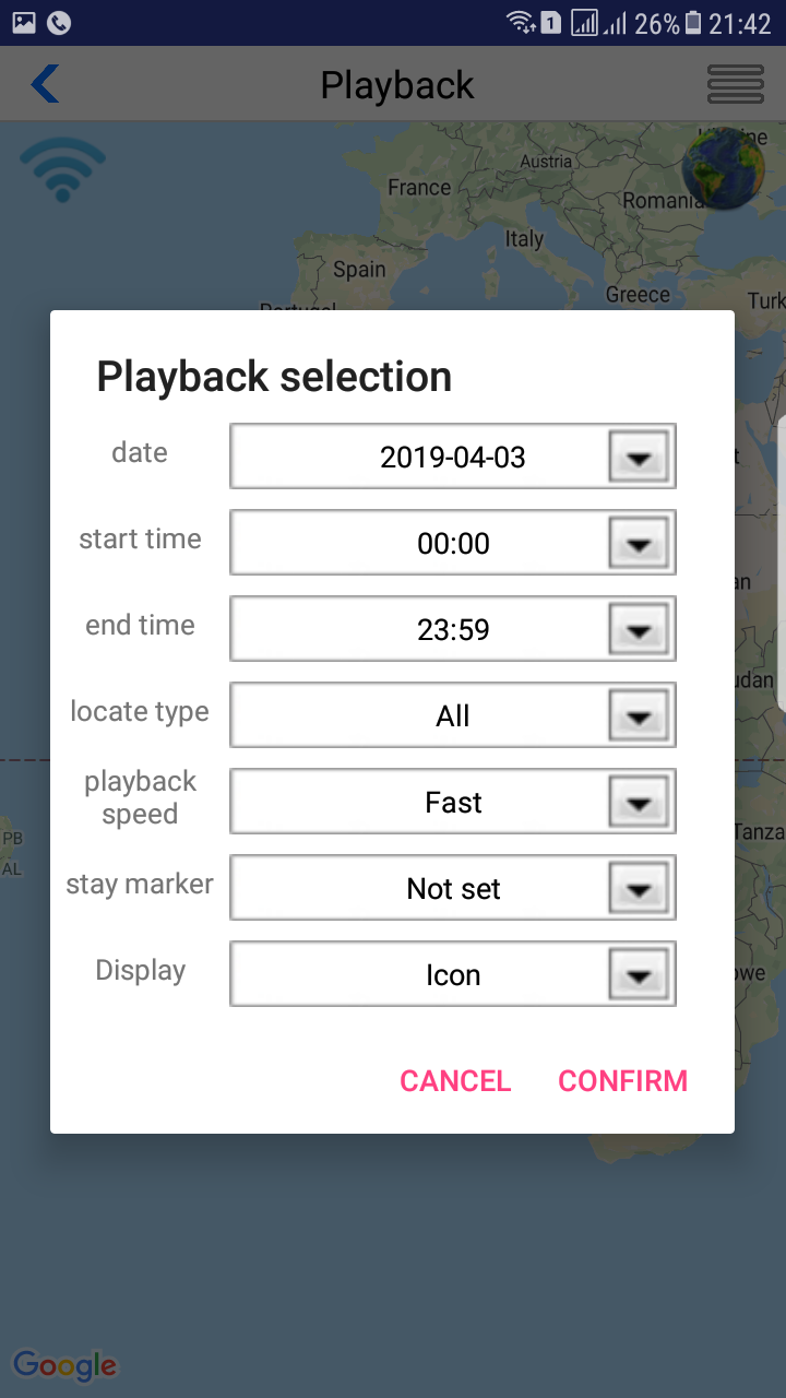 2./ Playback : Dùng để xem lại lộ trình di chuyển ( có thể chọn thời gian theo ngày và giờ theo yêu cầu muốn xem )